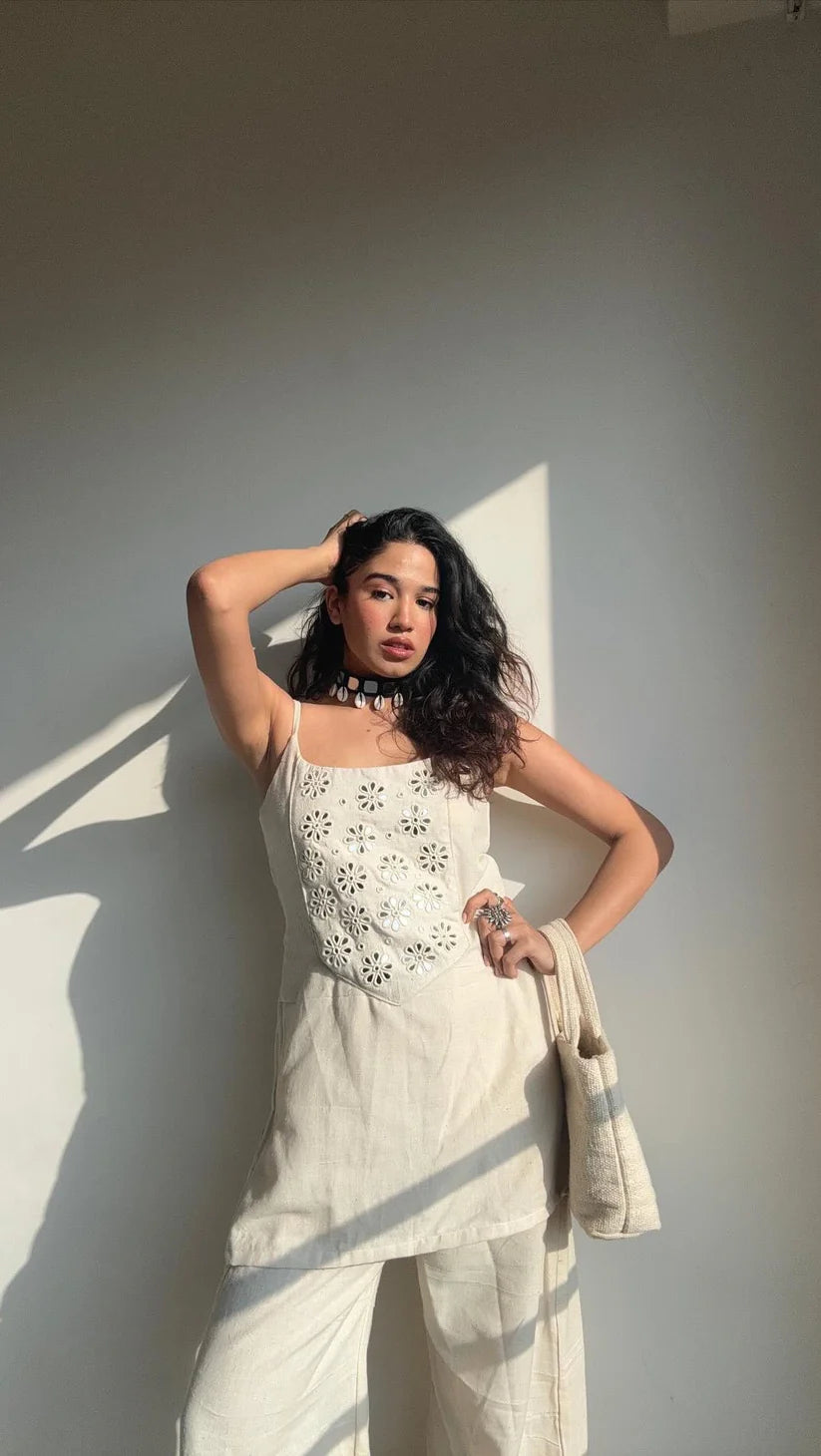 Crafted from premium breathable cotton, the "Aina" set is engineered for maximum comfort in high-heat environments. The sleeveless tunic features a unique pointed bodice adorned with intricate, hand-placed floral mirror work that captures and reflects natural light beautifully. Paired with coordinated wide-leg trousers, this cotton coord set offers a relaxed yet polished fit. Whether you are strolling through a sun-drenched city or enjoying a coastal retreat, this set provides a sophisticated, tactile aesthetic that is as light as a summer breeze.
