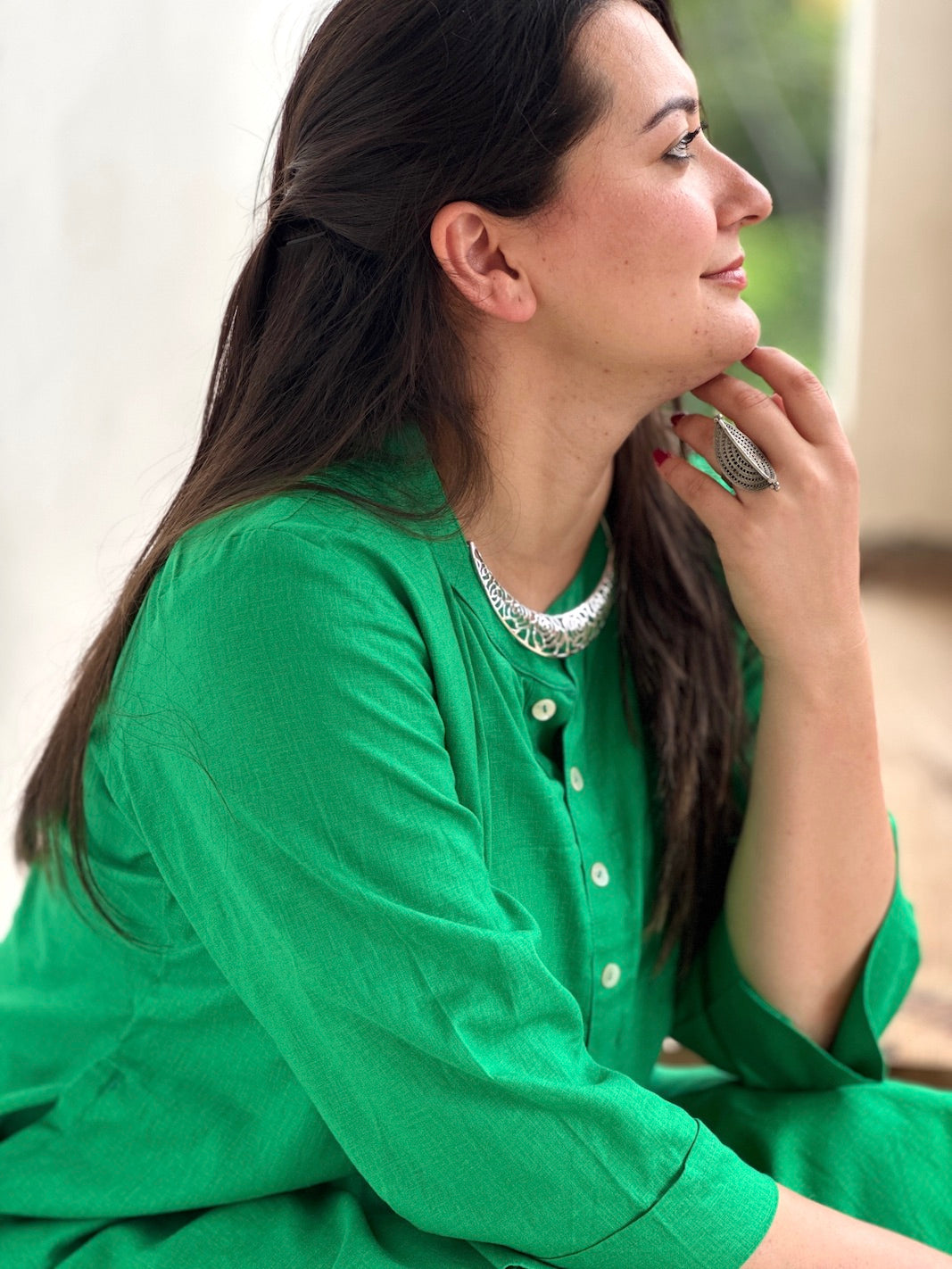 Crafted from 100% premium, breathable cotton, it's designed for the #dhiraiwoman who values all-day comfort and enduring style. The solid green kurta features a smart mandarin collar, a partial button placket, and a relaxed silhouette with a modern curved hem for easy movement.