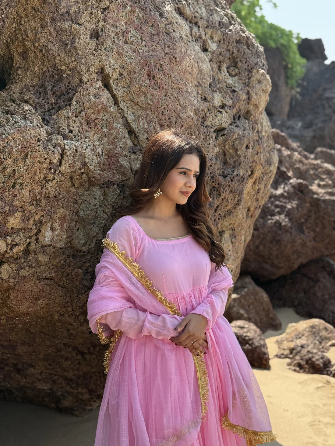 Delicate, dreamy, and full of grace — Dhirai’s Anvi Baby Pink Suit Set is designed for those who love soft elegance with a festive glow. Crafted in breathable cotton with a comfortable lining, the flared kurta drapes beautifully with every twirl. Paired with wide palazzos for ease and movement, and a sheer Kota Doria dupatta finished with golden lace, this set is the perfect balance of simplicity and charm.