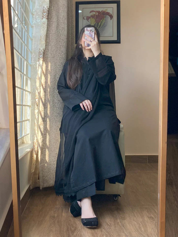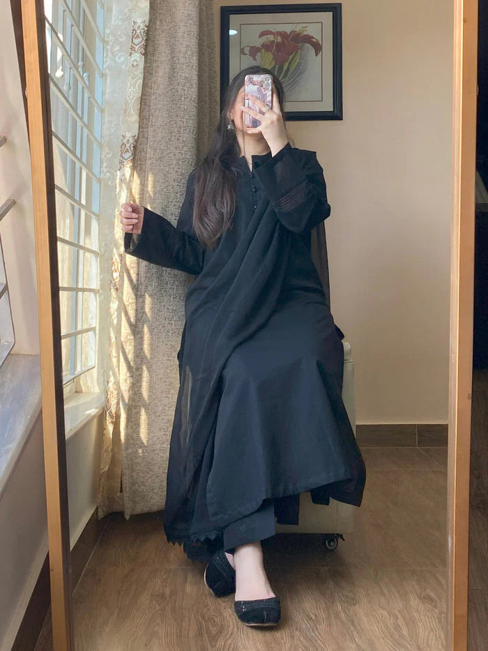 Crafted from premium Lawn Dobby fabric, the kurta features a subtle, self-textured weave that enhances breathability while providing a rich, multi-dimensional look. The ensemble is elevated by a flowing chiffon dupatta, which adds a layer of ethereal grace without adding weight. With a focus on a relaxed yet tailored silhouette, this set transitions effortlessly from professional day-wear to elegant evening gatherings.