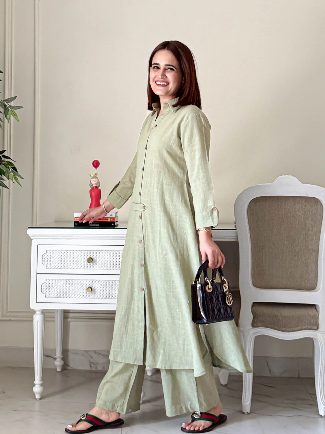 "Harita" - Sage Green Cotton Shirt-Style Kurta Set