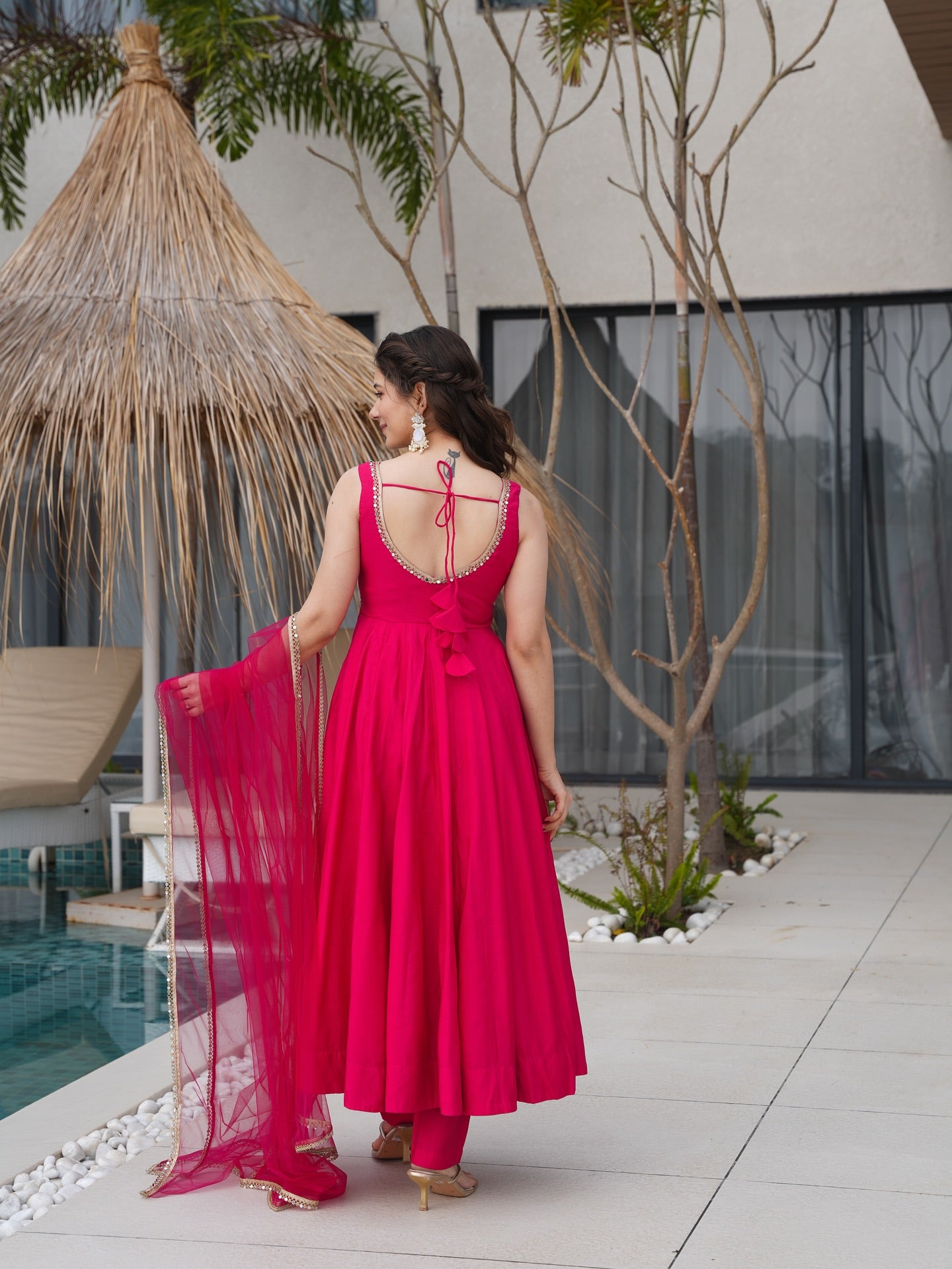 - Kurta: Anarkali-style flared silhouette with sleeveless cut