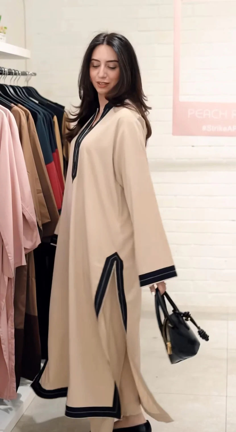 The elegant beige base is brought to life by a bold, graphic black trim that frames the mandarin collar, long-sleeved cuffs, deep side slits, and hem. Paired with matching beige trousers, this set is your new go-to for effortless power dressing, from high-stakes meetings to sophisticated evening events.