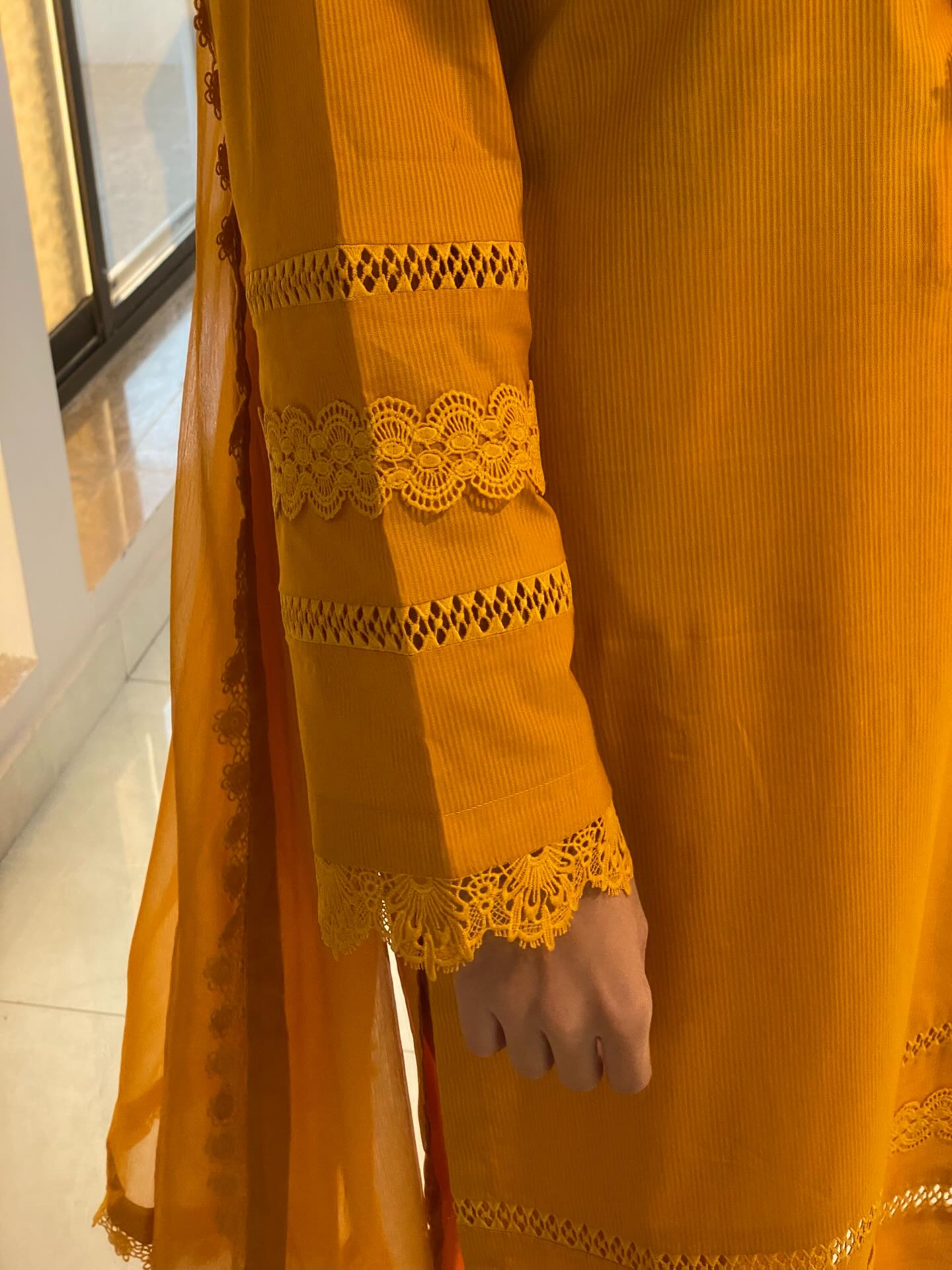 - Sleeves: Elegant full-length sleeves with tiered lace work and scalloped edges.