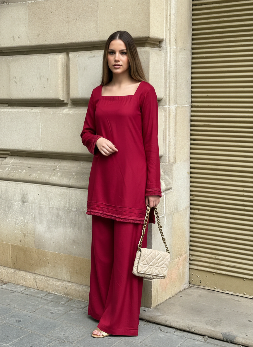 The set features a rich, deep red tunic made from high-quality rayon, known for its exceptional softness and luxurious drape. The tunic is accented with unique raw-edge fringe detailing at the hem and cuffs, adding a contemporary, artisanal touch to the classic silhouette. Paired with effortlessly flowy wide-leg trousers, this outfit provides comfort and style in equal measure. To balance the intensity of the ruby red, we've included a soft ivory dupatta with matching red borders, creating a high-contrast look that is both powerful and poised.