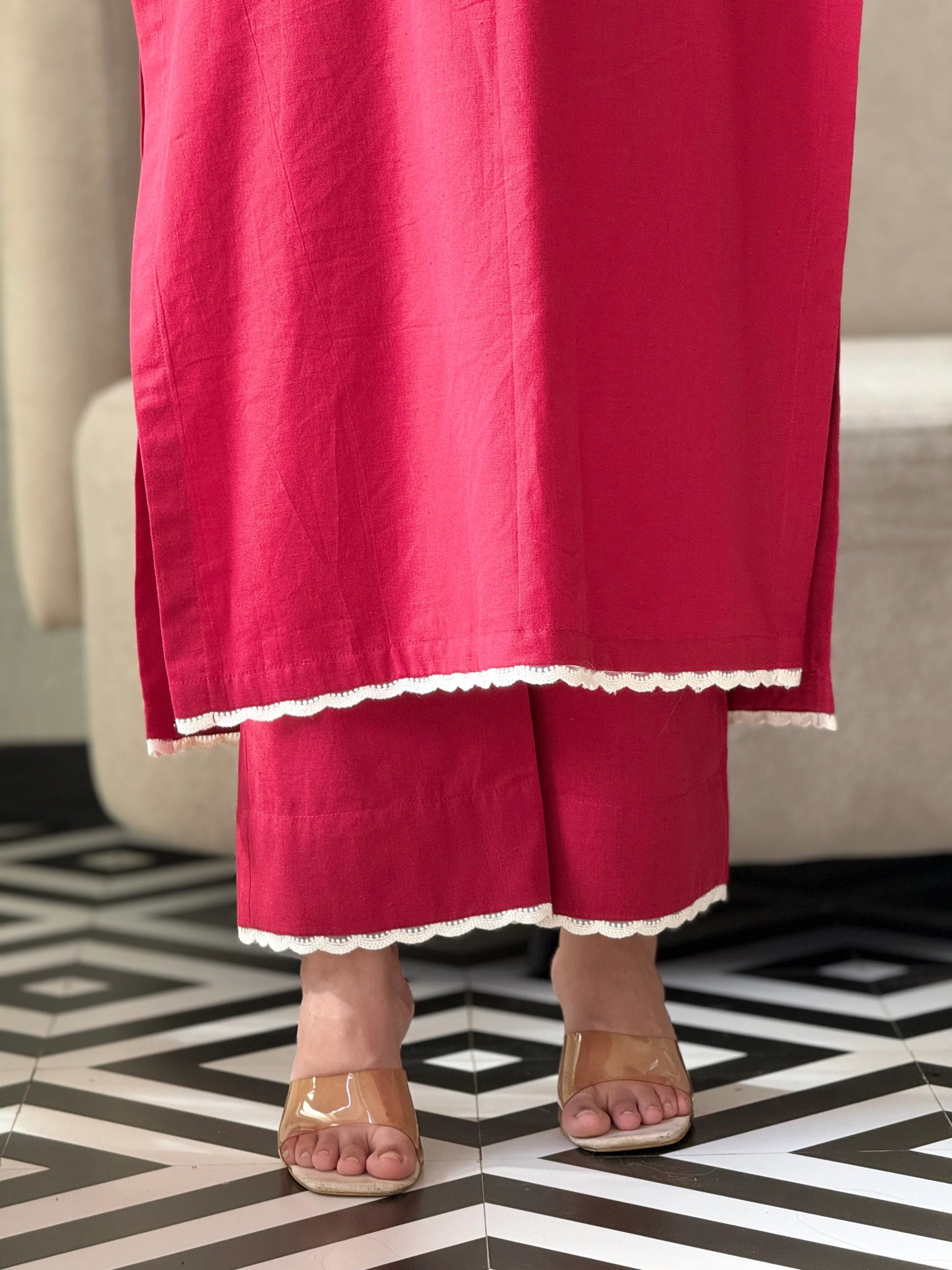 "Ruhi" — Radiant Red Cotton Flex Kurta Set with Scalloped Lace