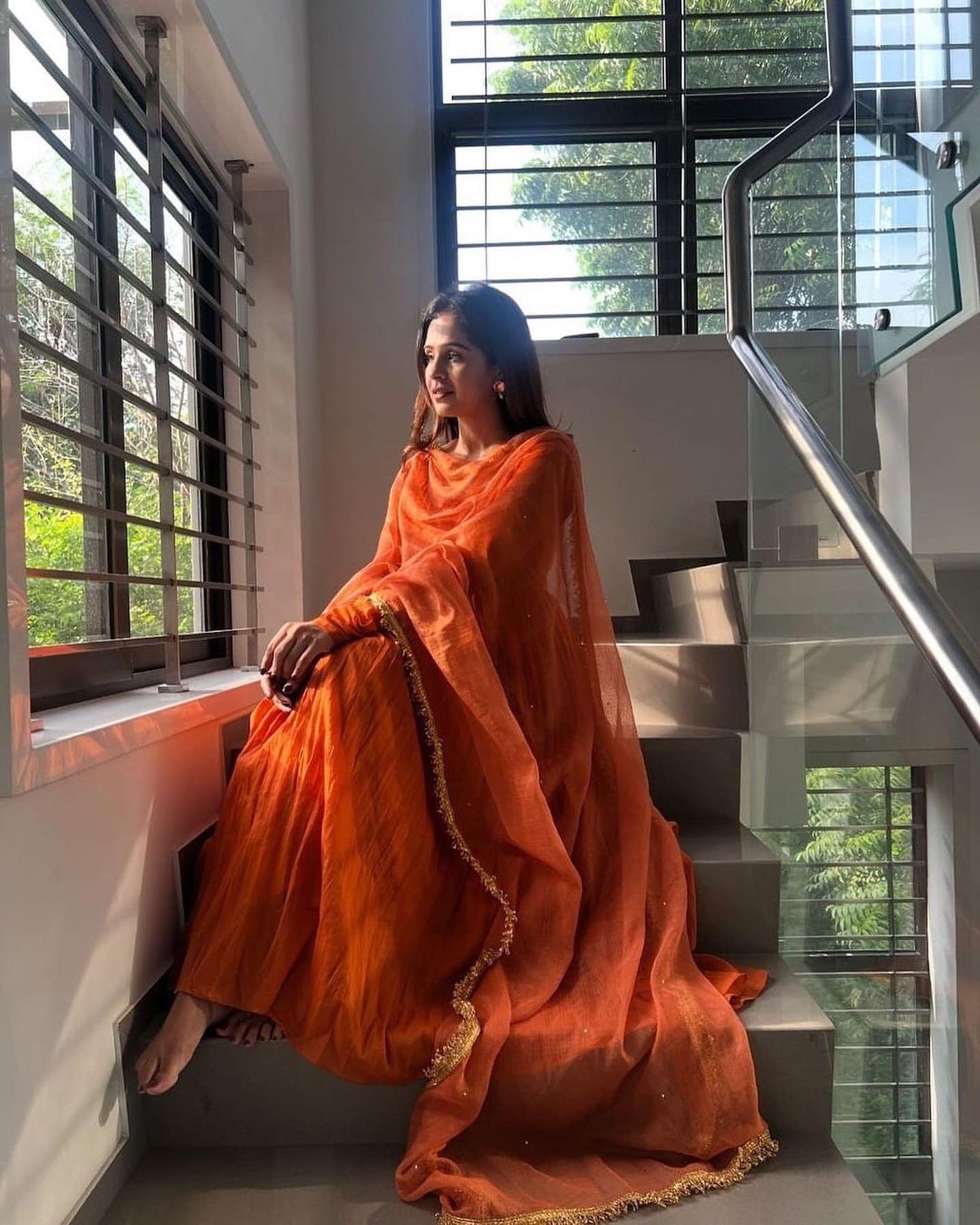 Grace meets comfort in the Saanvi Orange Mul Cotton Suit Set, a festive essential designed for both elegance and ease. The soft mul cotton kurta in a flared silhouette is adorned with delicate gota lace on the neckline and sleeves, radiating timeless charm. Paired with straight cotton pants and a lightweight Kota Doria dupatta highlighted with shimmering gota borders, this ensemble is perfect for festive mornings, pujas, and cultural celebrations.