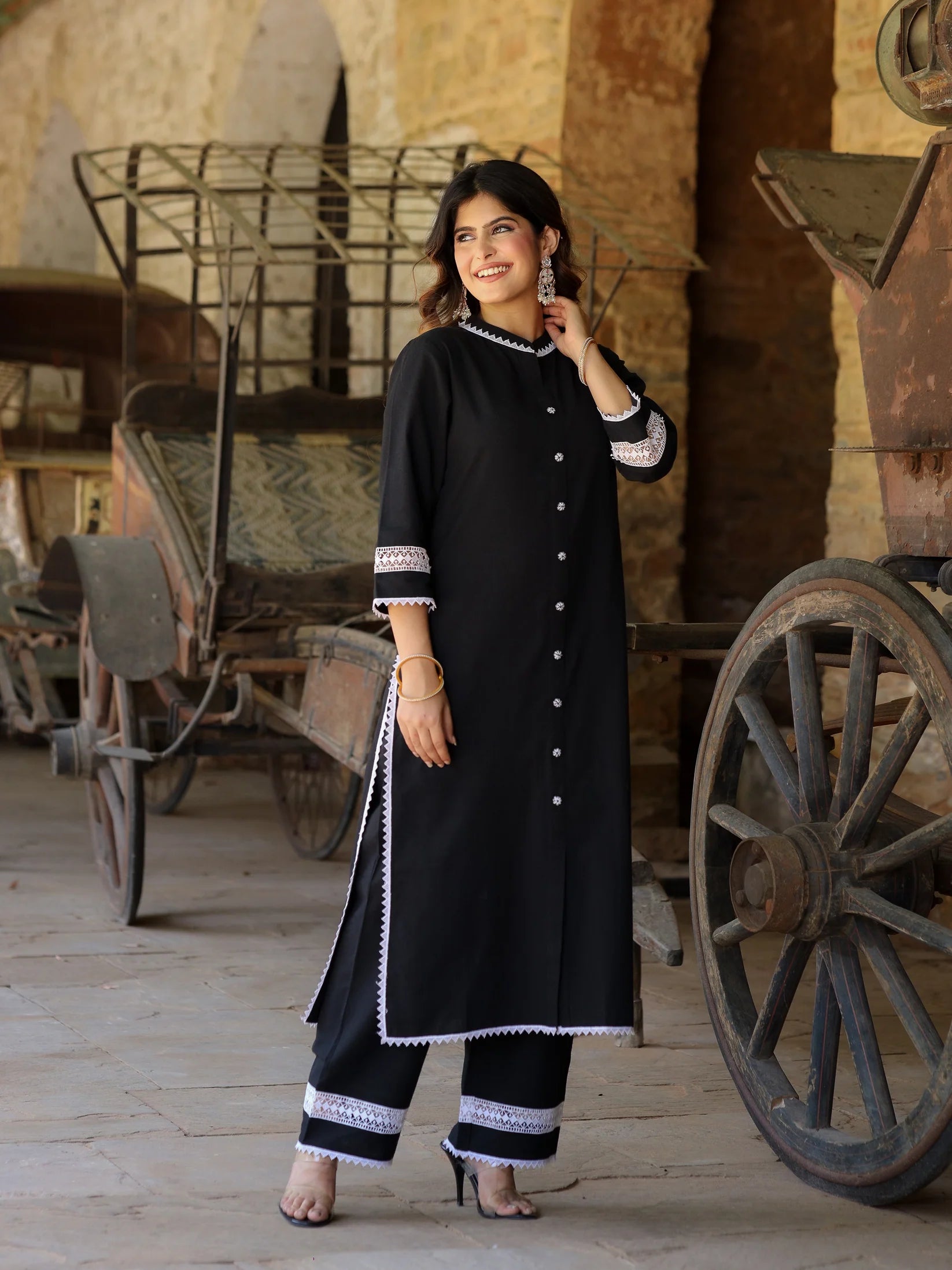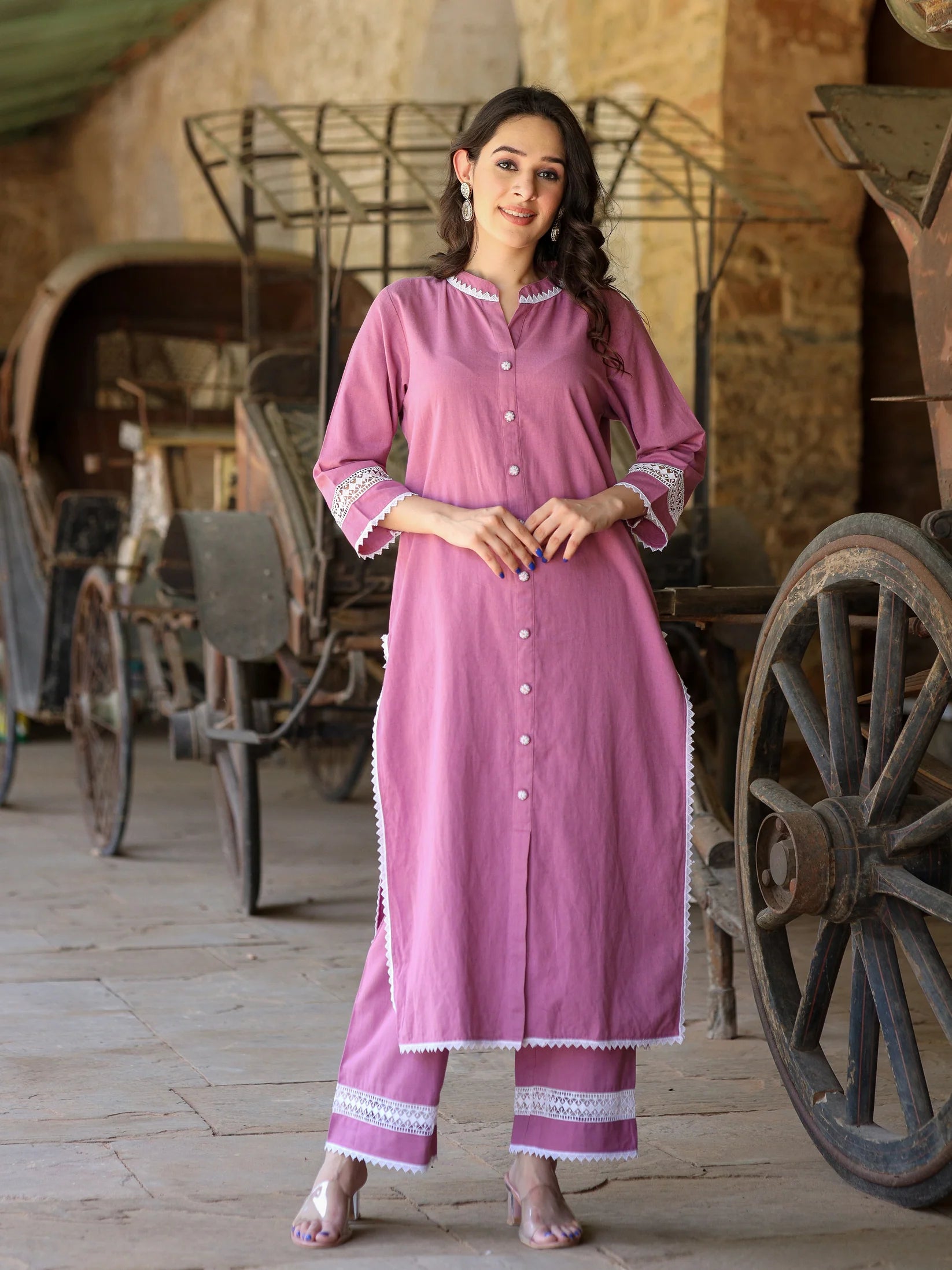 The "Saumya" collection features a sophisticated long-line kurta adorned with delicate white scalloped lace along the V-neckline, wide cuffs, and side slits, creating a soft contrast that shines in every shade. Whether you are drawn to the fiery energy of red, the professional calm of teal, the earthy warmth of beige, or the deep sophistication of wine, this ensemble provides a polished, coordinated look that transitions effortlessly from a professional setting to a relaxed evening out.