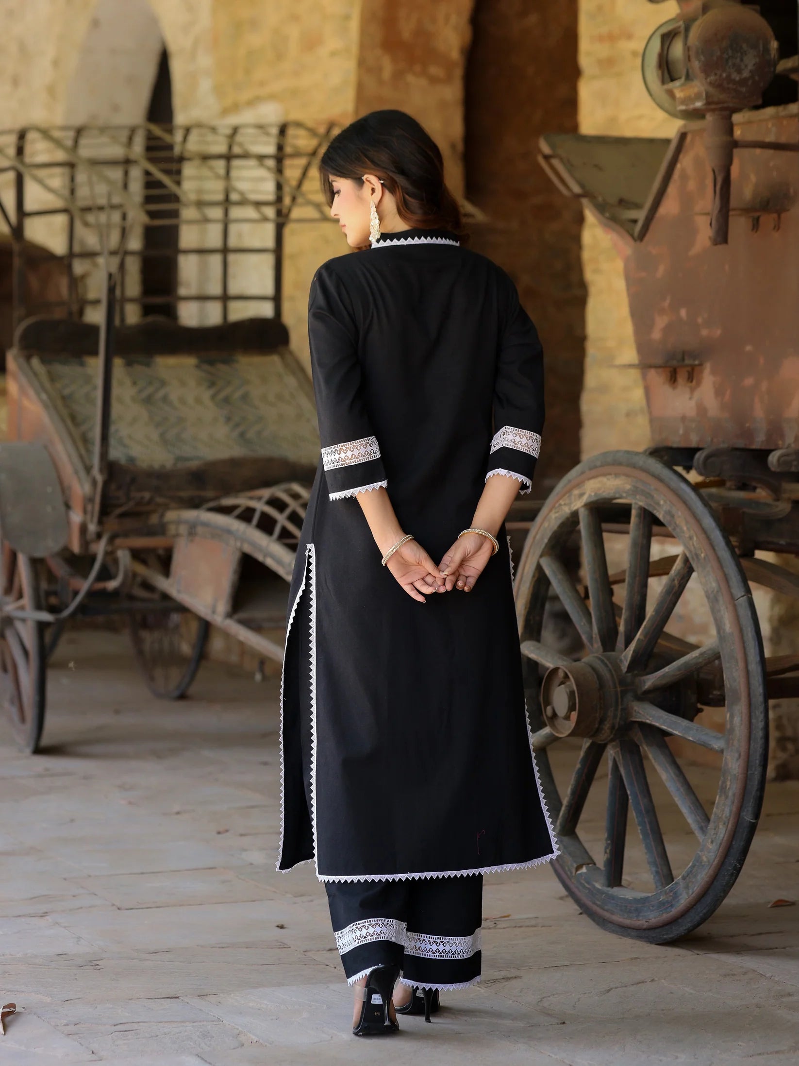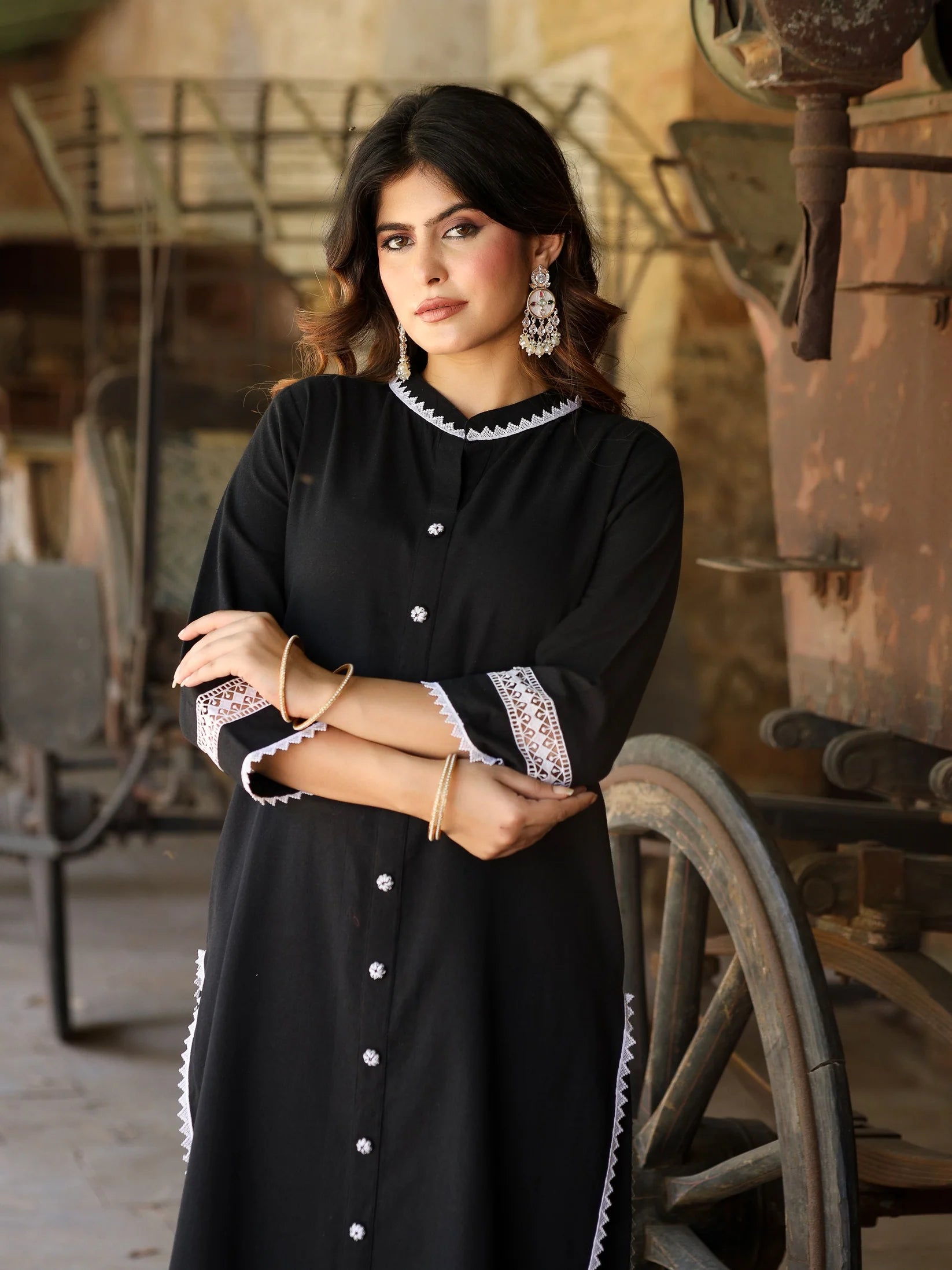 - Craft: Artisanal white scalloped lace detailing on the neck, sleeves, side slits, and hem.