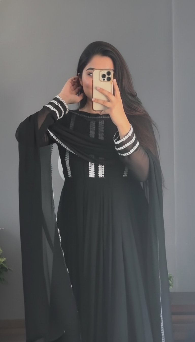 The kurta and dupatta are crafted from lightweight georgette, providing a beautiful, flowing drape and soft texture. The solid black color is richly sophisticated. The design is subtly elevated by high-contrast white/silver threadwork or lace detailing the yoke, sleeve cuffs, and dupatta edge, adding structure and visual interest.